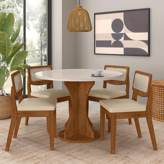 Mesa 4 Cadeiras Redonda C/vidro Santorini Fre/off/caramelo Cor Freijó/off Pre/corino Caramelo