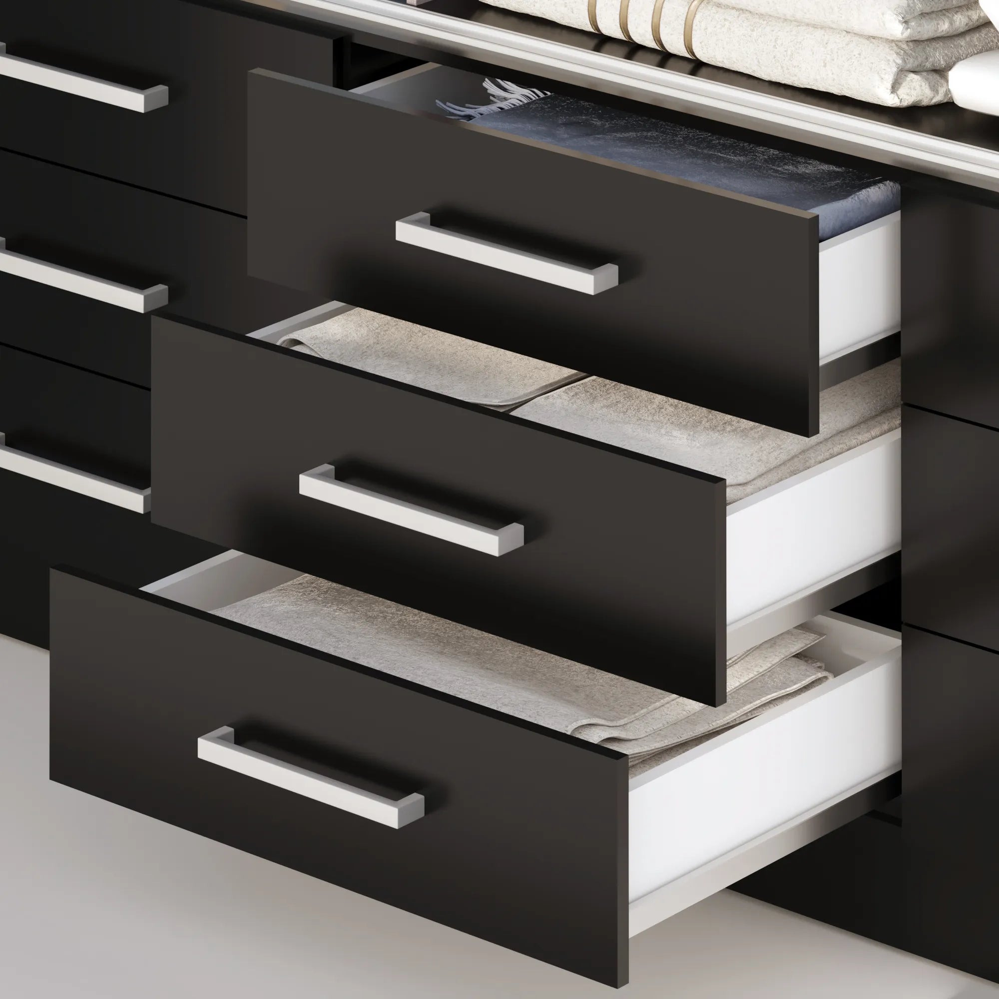 ✔ 6 gavetas com corrediças metálicas para abrir e fechar facilmente